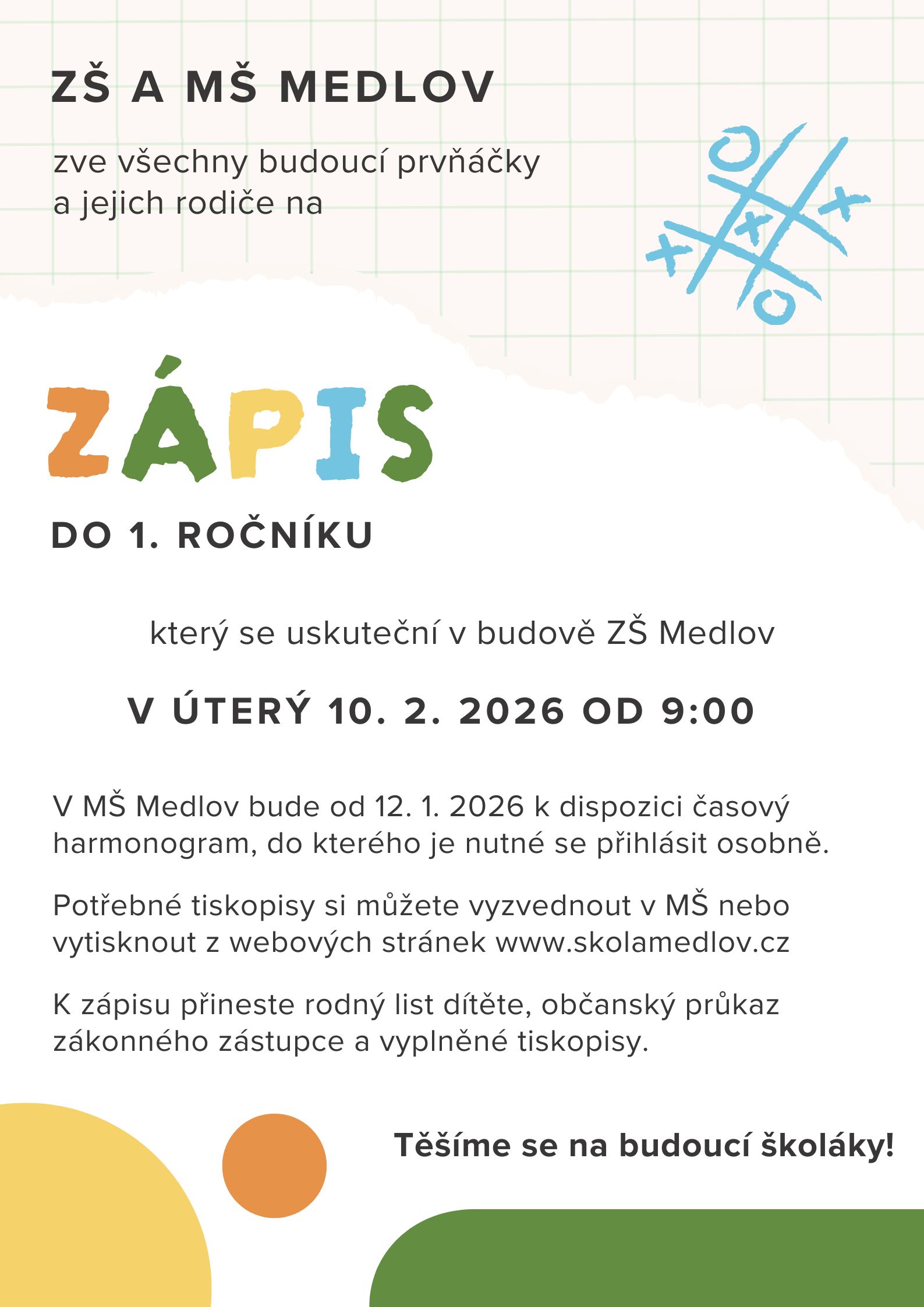 zápis do 1. ročníku základní školy pro školní rok 2026/2027 se v naší škole uskuteční v úterý 10. 2. 2026 od 9:00 hodin.