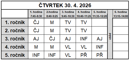 Ve čtvrtek 30. 4. 2026 dojde z organizačních důvodů ke změně rozvrhu hodin. Vyučování bude probíhat dle tabulky níže.